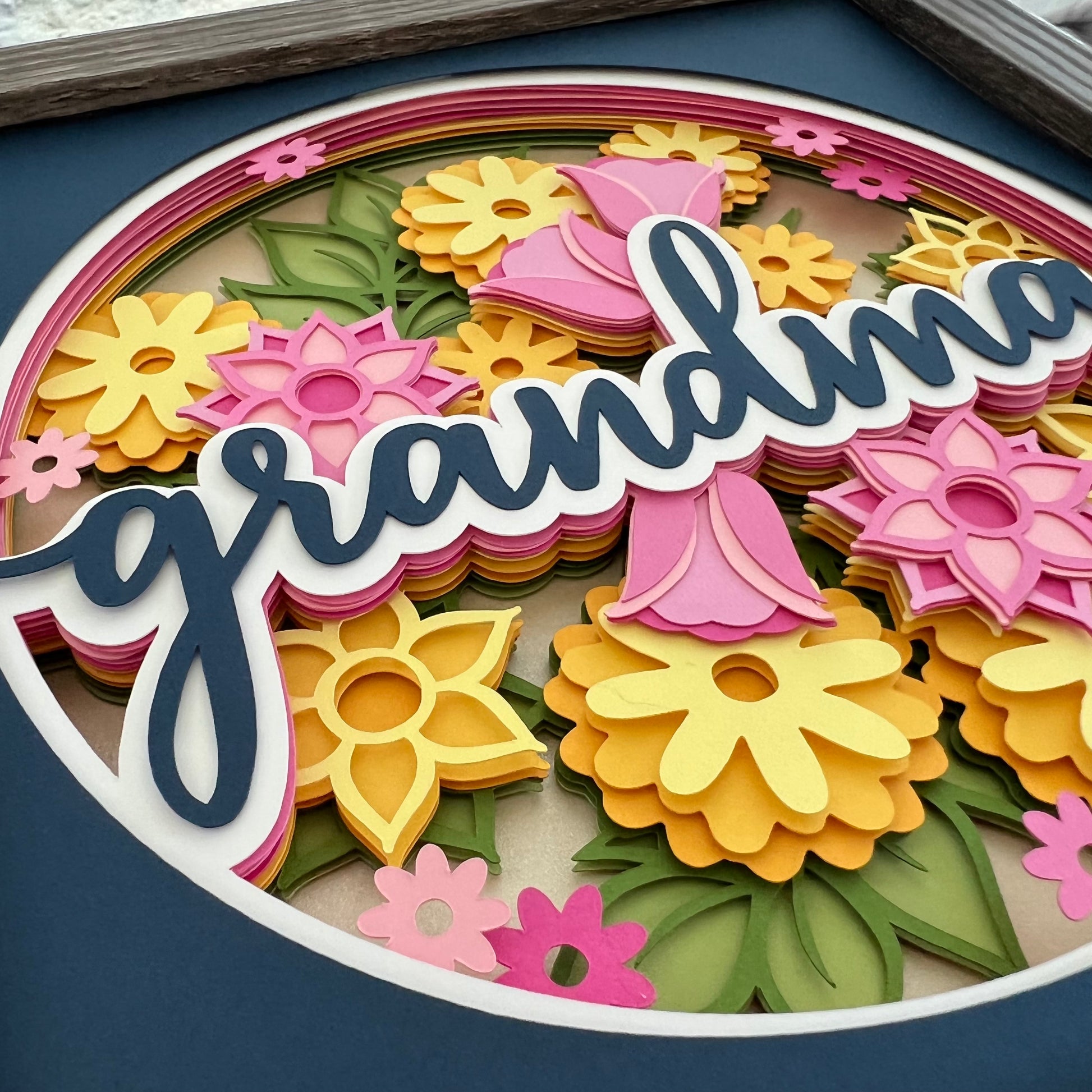 Multi-layered cardstock art. Cut and assembled by hand, this art has adhesive foam in between the layers to give it a 3-dimensional look. This listing is for the art in an 8”x8” shadowbox.