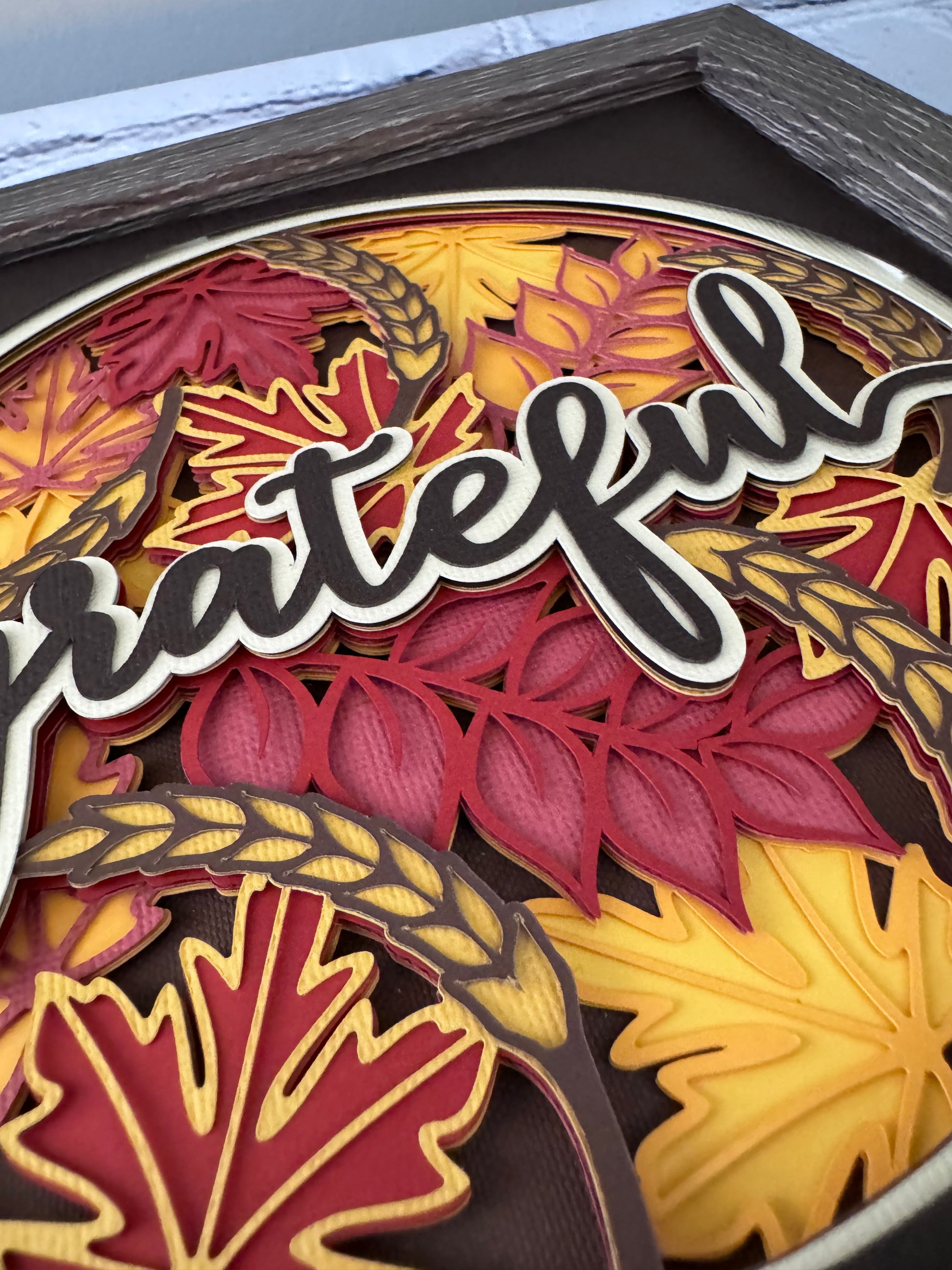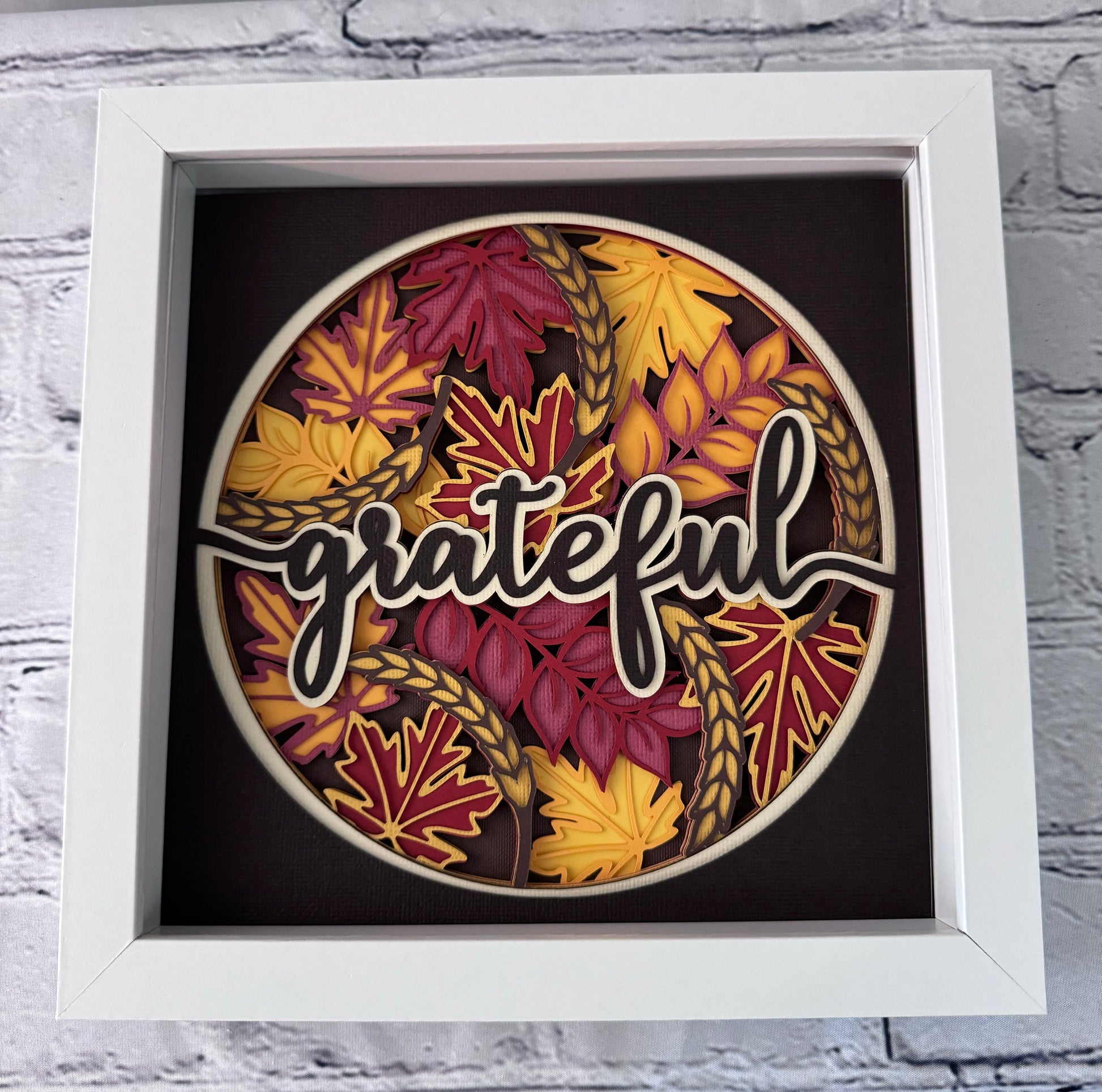 Multi-layered cardstock art. Cut and assembled by hand, this art has adhesive foam in between the layers to give it a 3-dimensional look. This listing is for the art in an 8”x8” shadowbox.