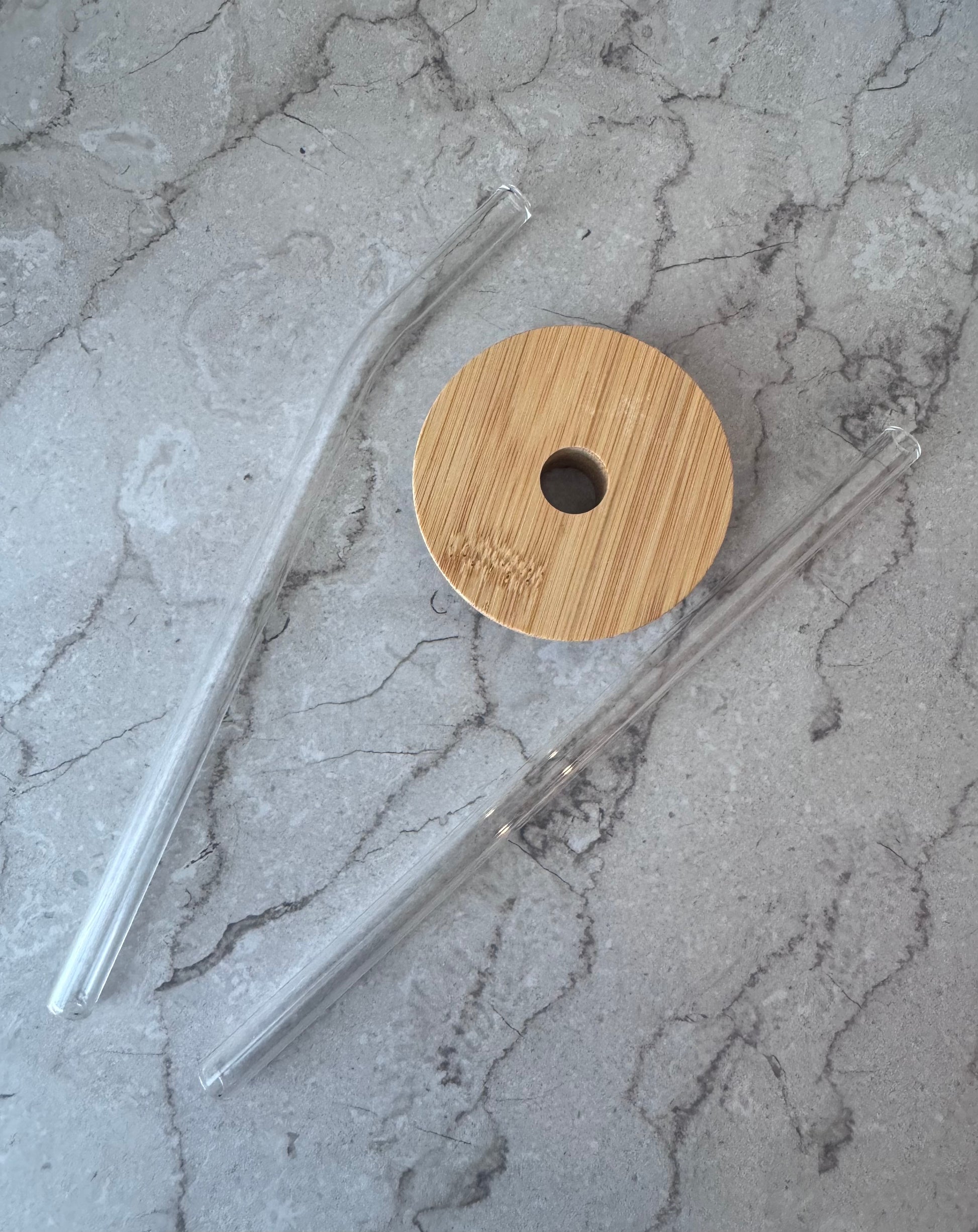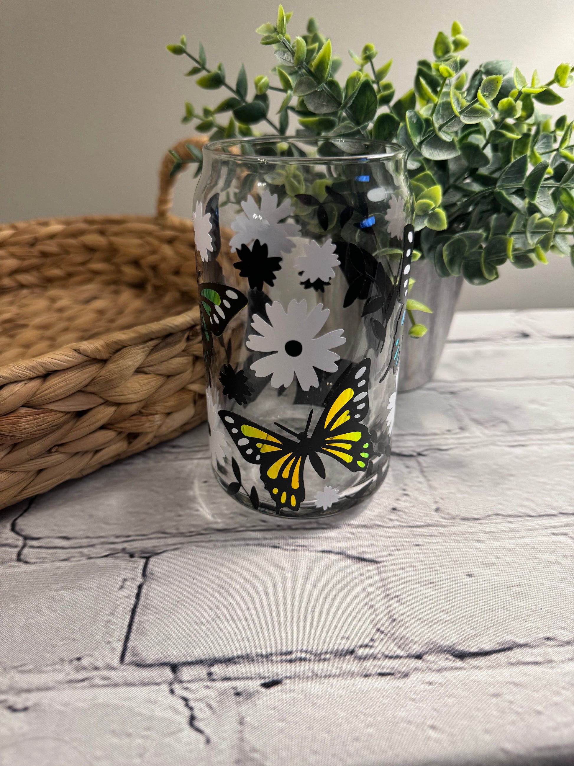 Beer can style glass. Perfect for iced coffee or any other type of cold drink! Designs are made from premium permanent vinyl and hand applied. Placement and color of designs may vary slightly from glass to glass. Bamboo lid and glass straw are included. This glass makes the perfect gift!