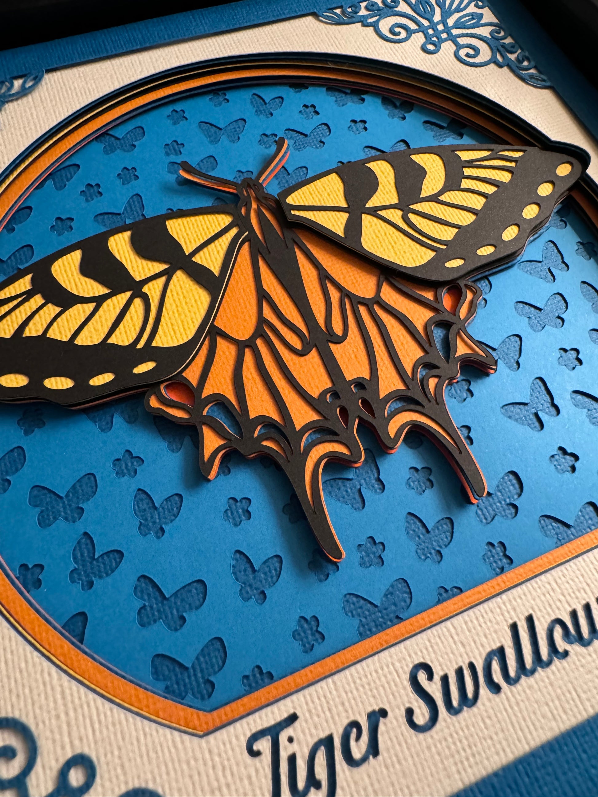 Intricate frame tiger swallowtail butterfly 3D paper art in a shadowbox
