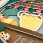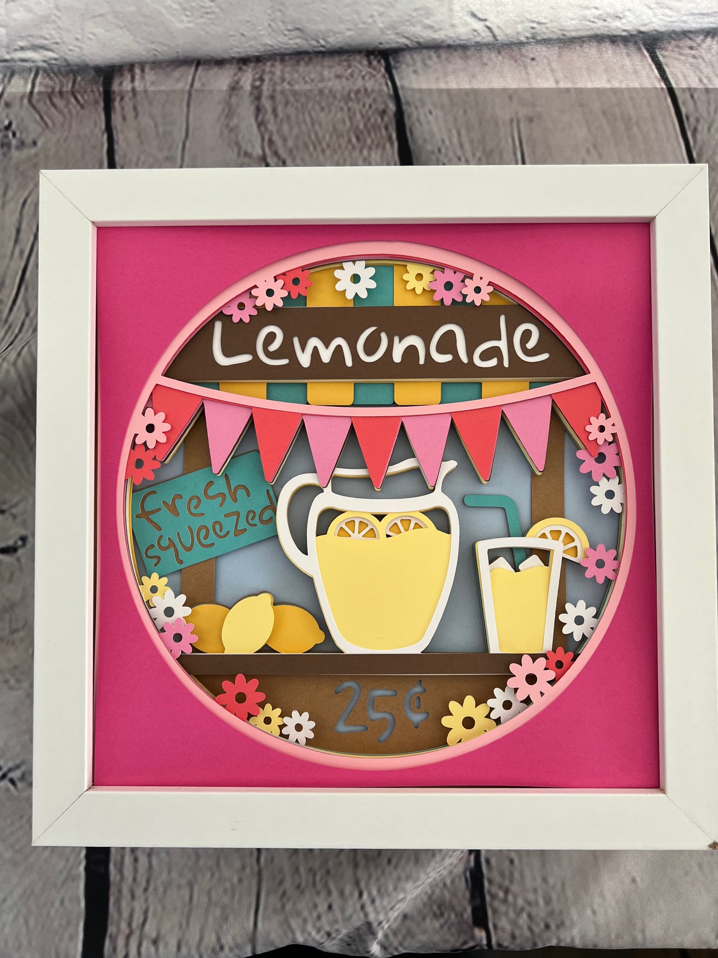Multi-layered cardstock art. Cut and assembled by hand, this art has adhesive foam in between the layers to give it a 3-dimensional look. This listing is for the art in an 8”x8” shadowbox.