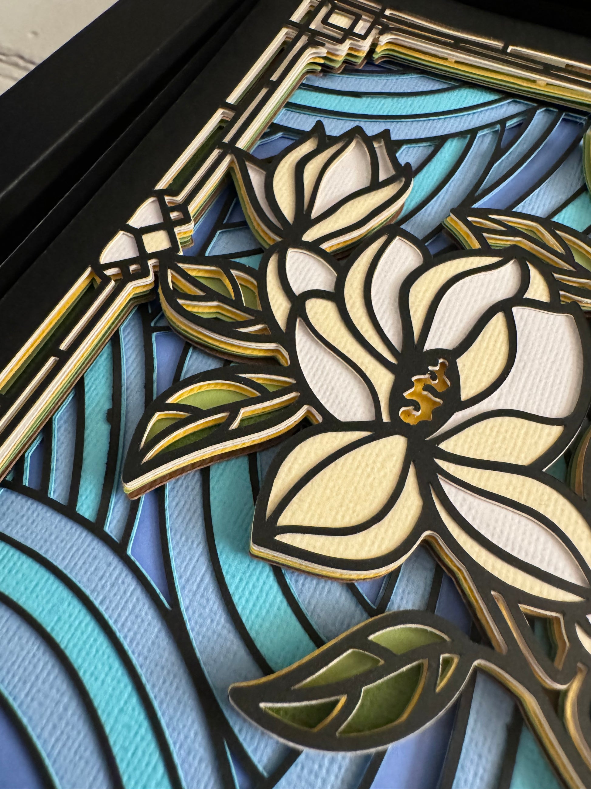 Stained glass magnolia 3D paper art in a shadowbox