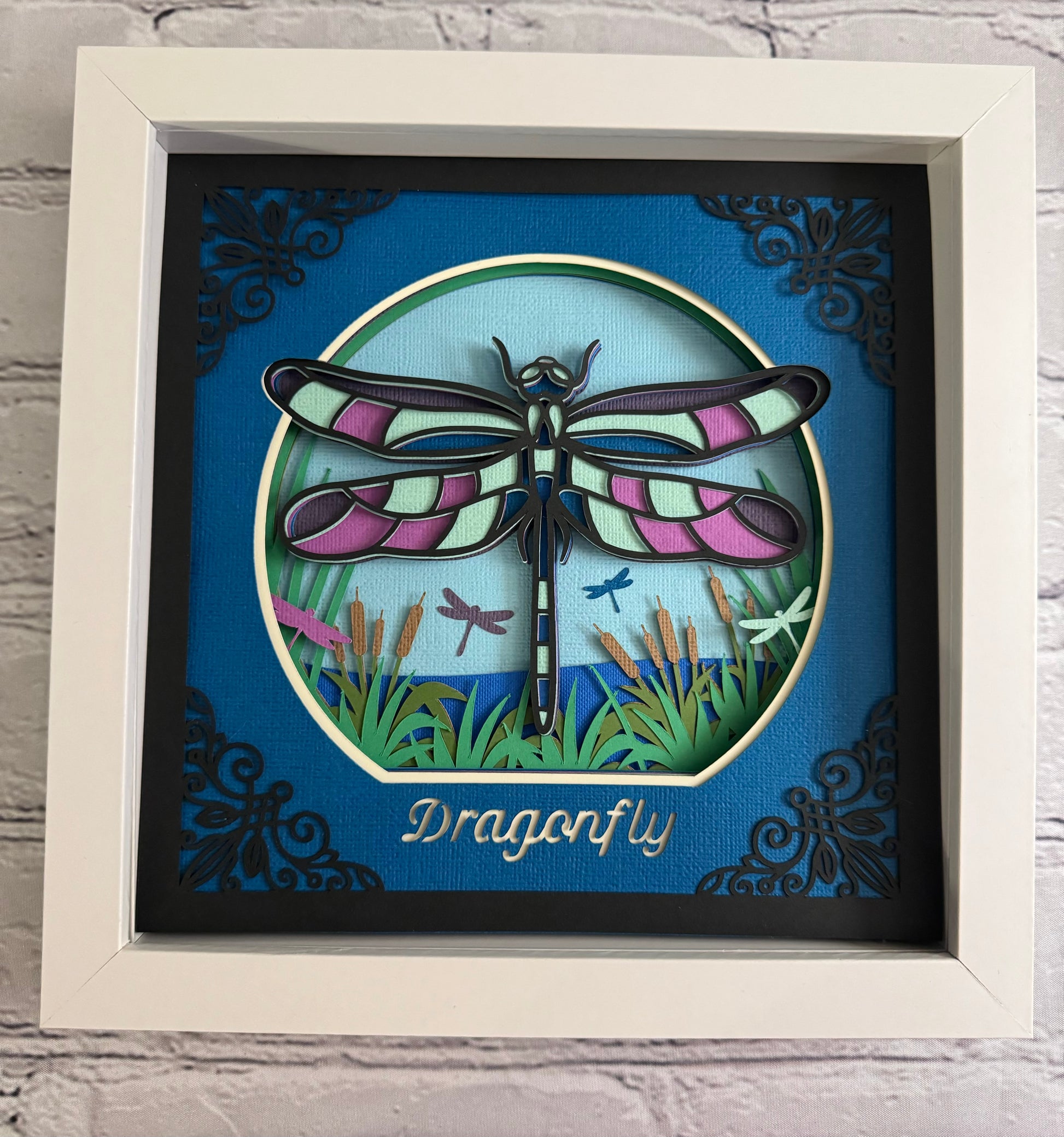 Intricate frame dragonfly 3D paper art in a shadowbox