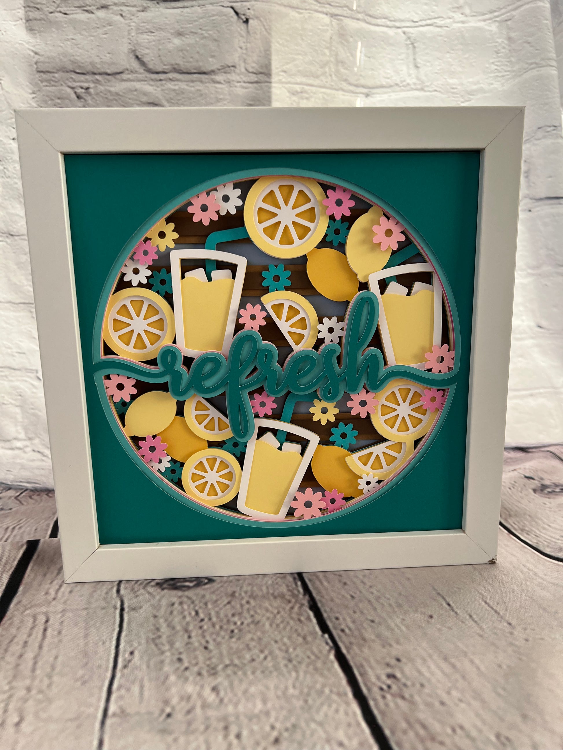 Multi-layered cardstock art. Cut and assembled by hand, this art has adhesive foam in between the layers to give it a 3-dimensional look. This listing is for the art in an 8”x8” shadowbox.
