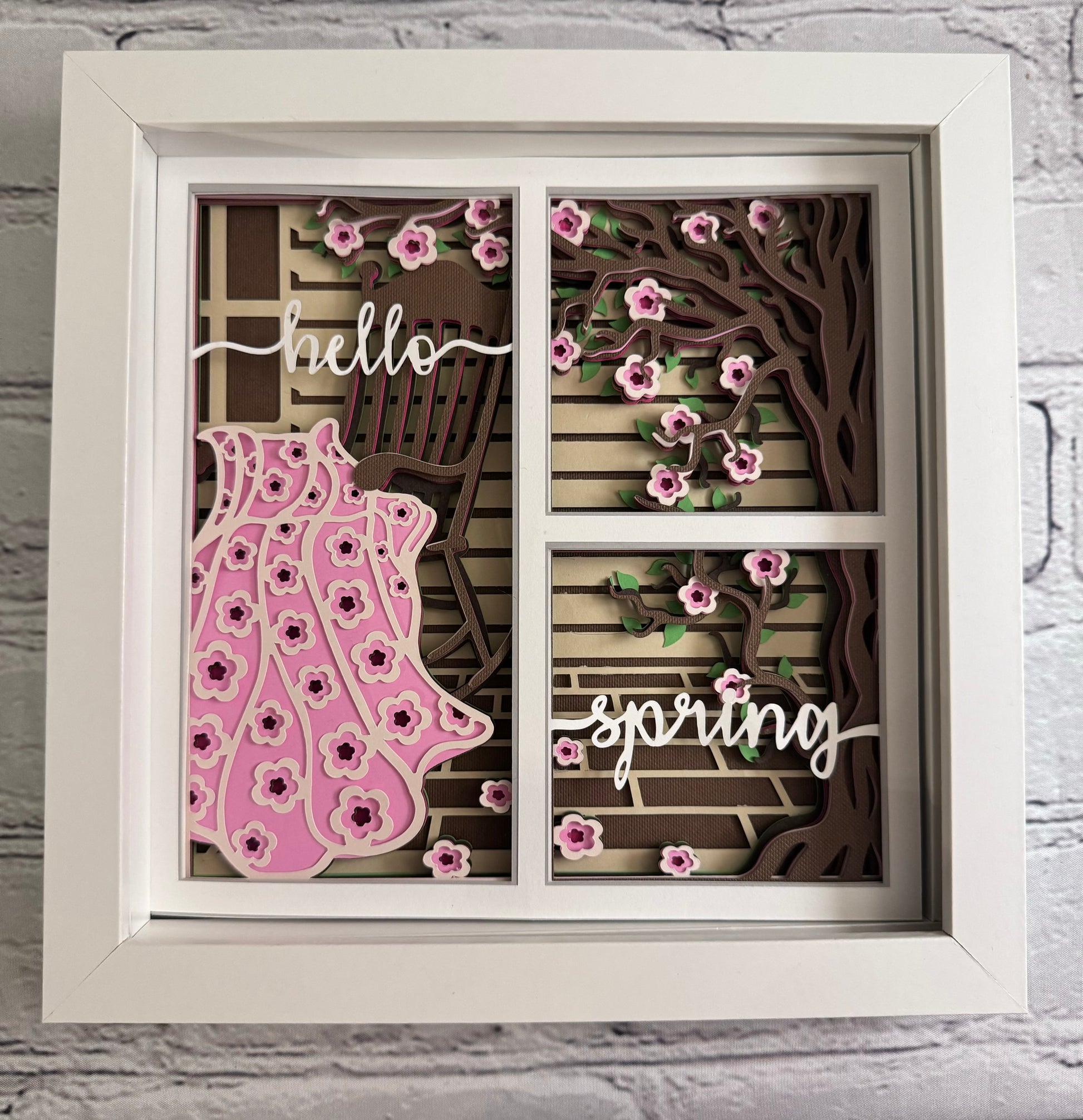 Spring porch scene with blanket 3D paper art in a shadowbox