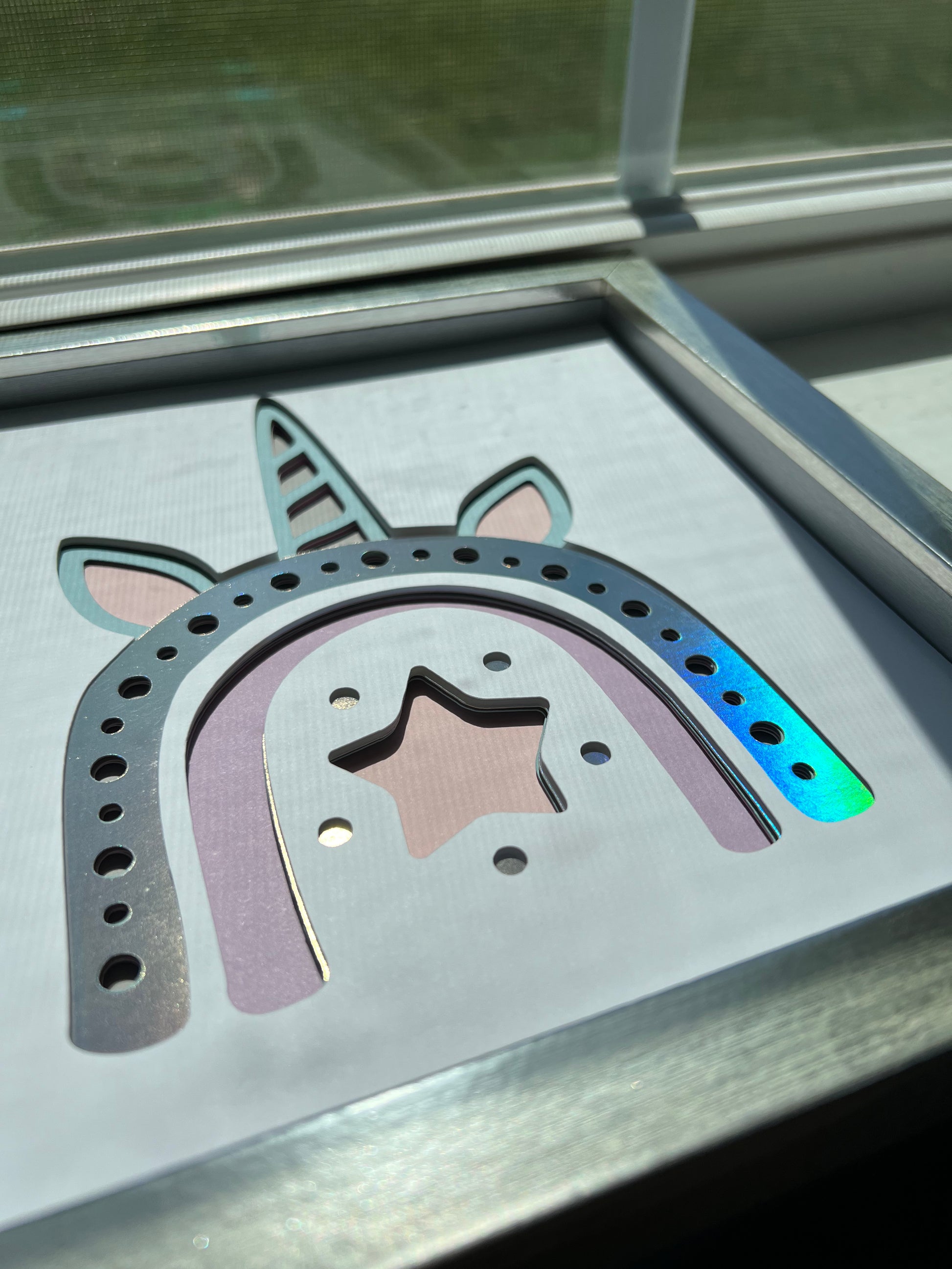 Multi-layered cardstock art. Cut and assembled by hand, this art has adhesive foam in between the layers to give it a 3-dimensional look. This listing is for the art in an 8”x8” shadowbox.
